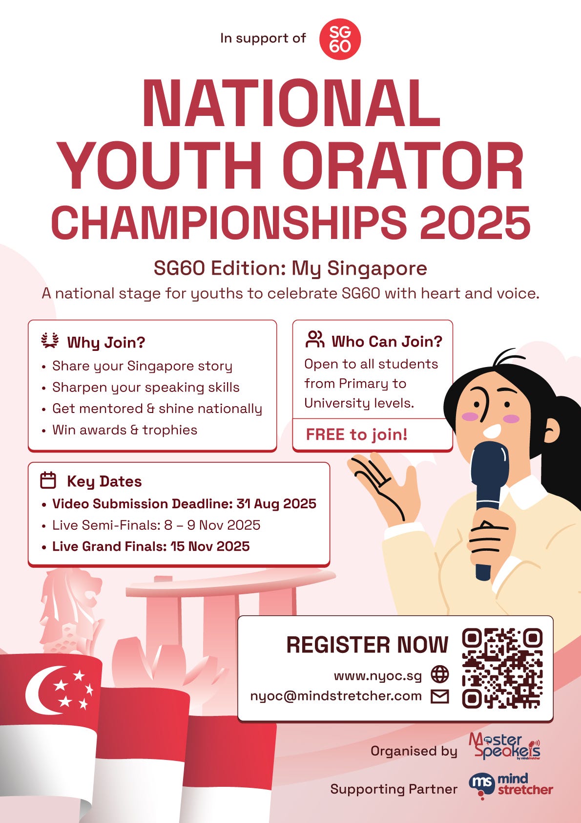 In support of SG60, we’ve put together the National Youth Orator Championships (NYOC) 2025, a national platform for your voice to be heard. Organised by Master Speakers and supported by Mind Stretcher, we’re inviting students from Primary all the way to University to speak from the heart. Participants will compete in 4 categories and explore themes that connect Singapore’s past, present and future. So whether you're passionate about our heritage, concerned about today's issues, or excited about tomorrow’s possibilities, there’s a stage for you!