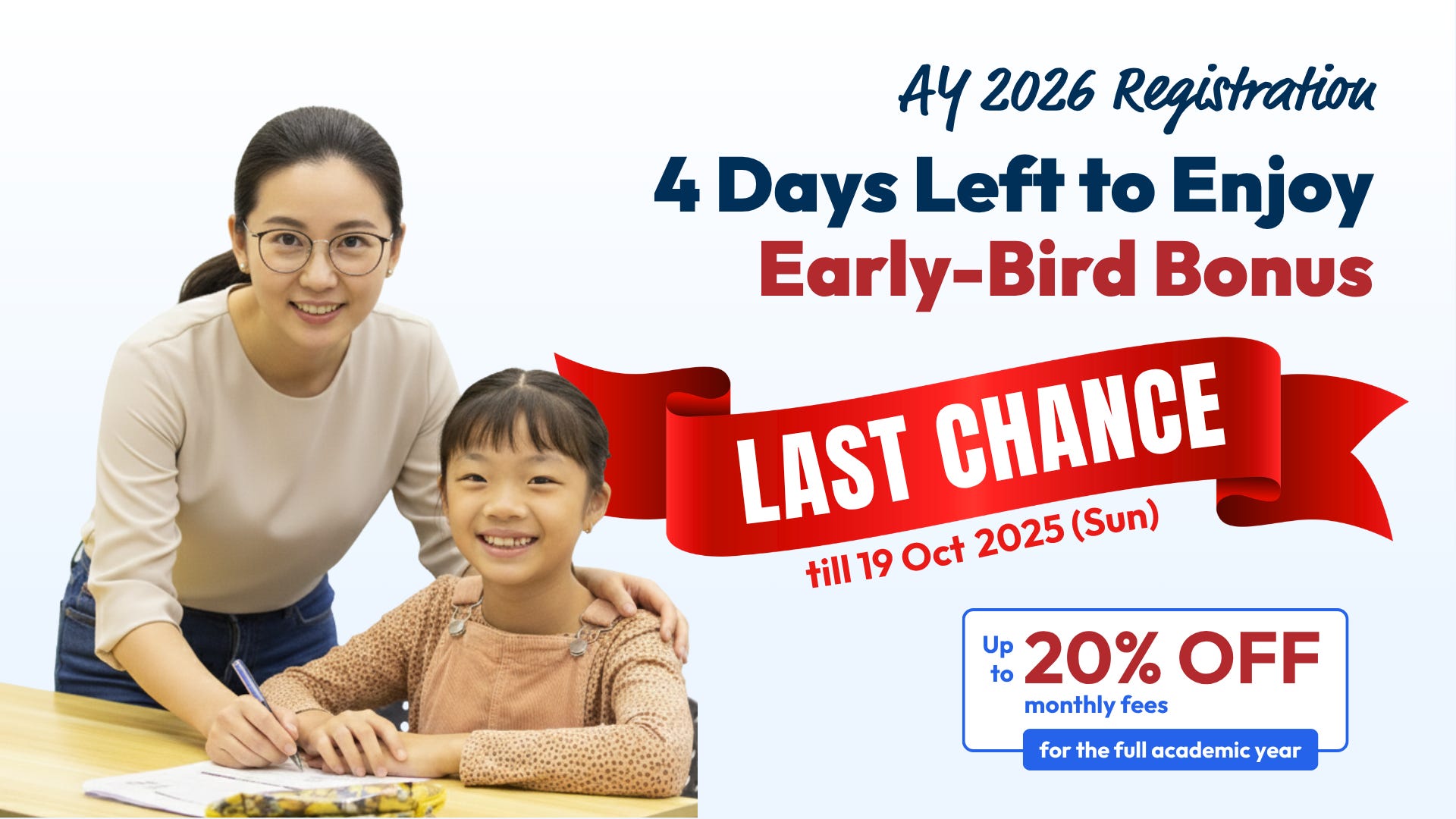 A quick reminder that our early-bird registration closes on 19 October 2025 (Sun). Secure your child’s classes early and enjoy over $900 in savings, including up to 20% off monthly fees and fee waivers.